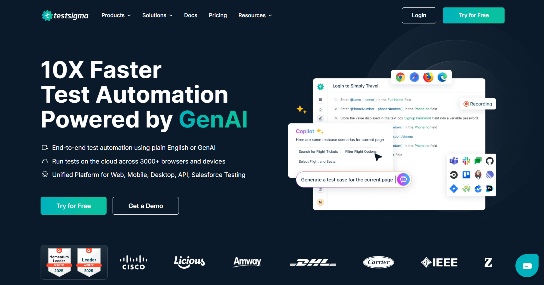 Testsigma is a codeless GenAI-powered test automation platform that supports web, mobile, API, desktop, SAP, and Salesforce testing in one platform. You can create automated tests in plain English using Copilot, NLP, or Recorder without any coding expertise.