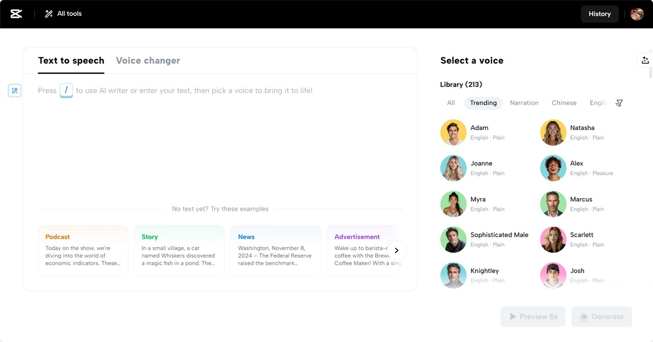 Expressive narration may even help basic slideshows, animations, and storytelling films. CapCut Web lets you select from a range of voices – male, female, young, elderly – and even change the speed and pitch to fit various characters or emotions.